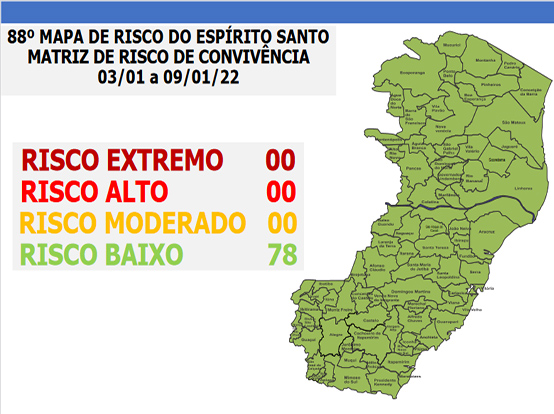 O Governo do Estado anunciou, nesta sexta-feira (26), o 83º Mapa de Risco Covid-19, que terá vigência desta segunda-feira (29) até o próximo domingo (05). Todos os 78 municípios capixabas estão classificados em Risco Baixo. Não há maios municípios em Risco Moderado ou Alto. Até o momento, nenhuma microrregião conseguiu atingir os três índices para a classificação de Risco Muito Baixo.