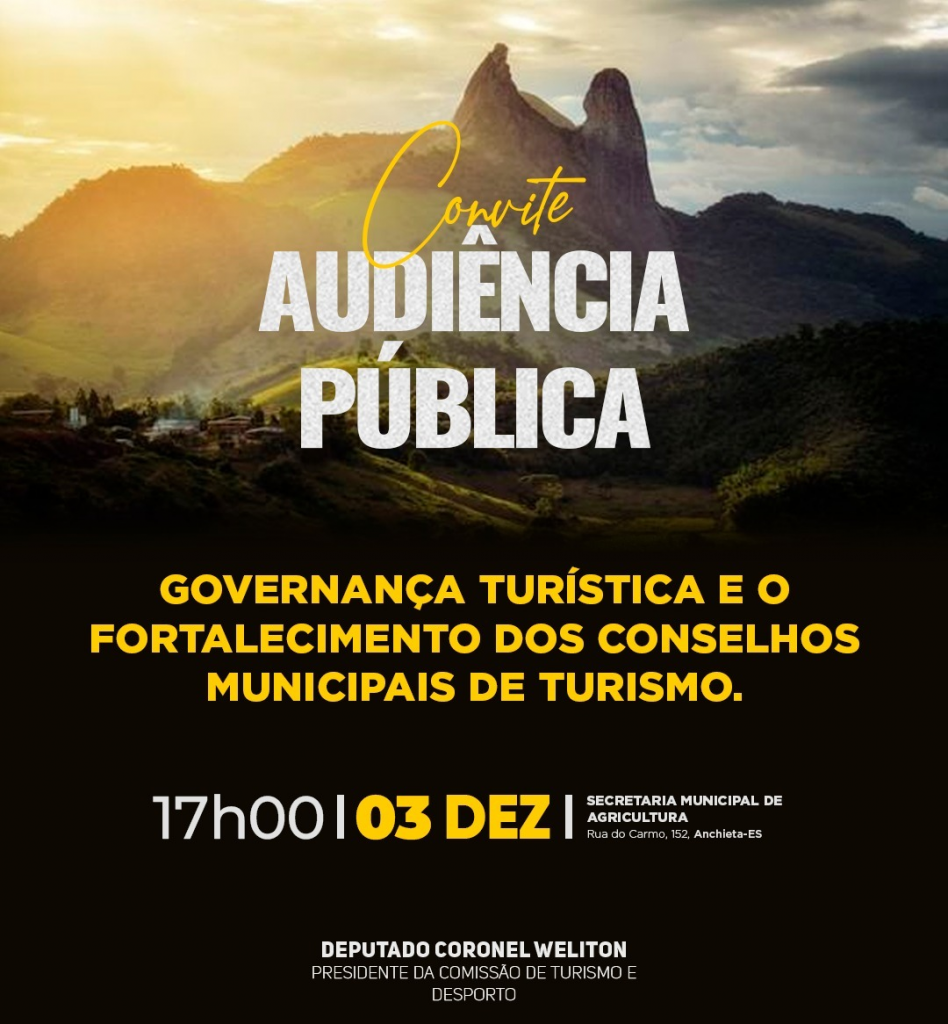 No próximo dia 3 de dezembro, por iniciativa do deputado Estadual Coronel Weliton, que está na presidência da Comissão de Turismo e Desporto da Assembleia Legislativa do Espirito Santo, fará uma Audiência Pública, no auditório da Secretaria de Agricultura de Anchieta, para a discussão do tema – “Governança Turística e o Fortalecimento dos Conselhos Municipais de Turismo”