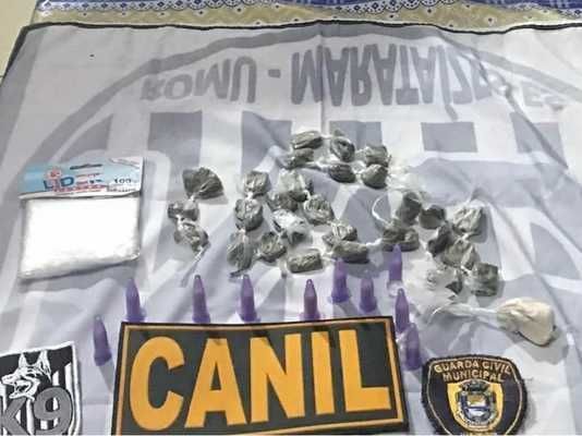 Além de uma balança de precisão, os GCM's apreenderam 10 pinos de cocaína, 8 gramas da mesma substância e 28 buchas de maconha. Não foi localizado os donos das drogas apreendidas.