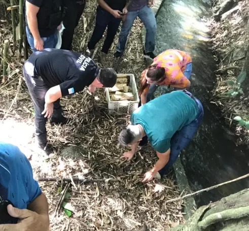 Policiais recolhem a droga espalhada ao longo de um aqueduto no rio Itapemirim