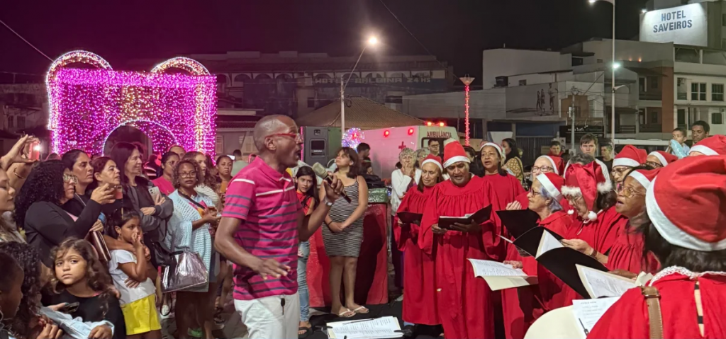 Neste sábado (27), as 19h30, e também nos dias 10 e 17 de dezembro também acontecem novas apresentações do espetáculo “É tempo de Esperança”, na Praça Domingos José Martins, que está toda decorada e ornamentada, com a casa do Papai Noel, árvore de natal e iluminação especial.