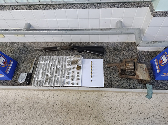Na noite de domingo (18), por volta das 20h, os policiais realizaram patrulhamento preventivo no bairro Camurugi quando ouviram disparos de arma de fogo. Os militares conseguiram identificar o local e realizaram a abordagem policial na propriedade. Após buscas no imóvel foi localizado 47 buchas grandes de substância similar a maconha, 9 buchas menores, 3 pedaços de tamanho mediano e 1 pedaço maior da substância mencionada, 6 munições de calibre .38, 1 munições de calibre .22, 1 balança de precisão, 1 faca para cortar maconha, 1 espingarda de fabricação caseira calibre .36 adaptada para .380 e 1 revólver de fabricação caseira calibre .12. Um homem de 54 anos foi detido em posse dos materiais. (Imagem 01)