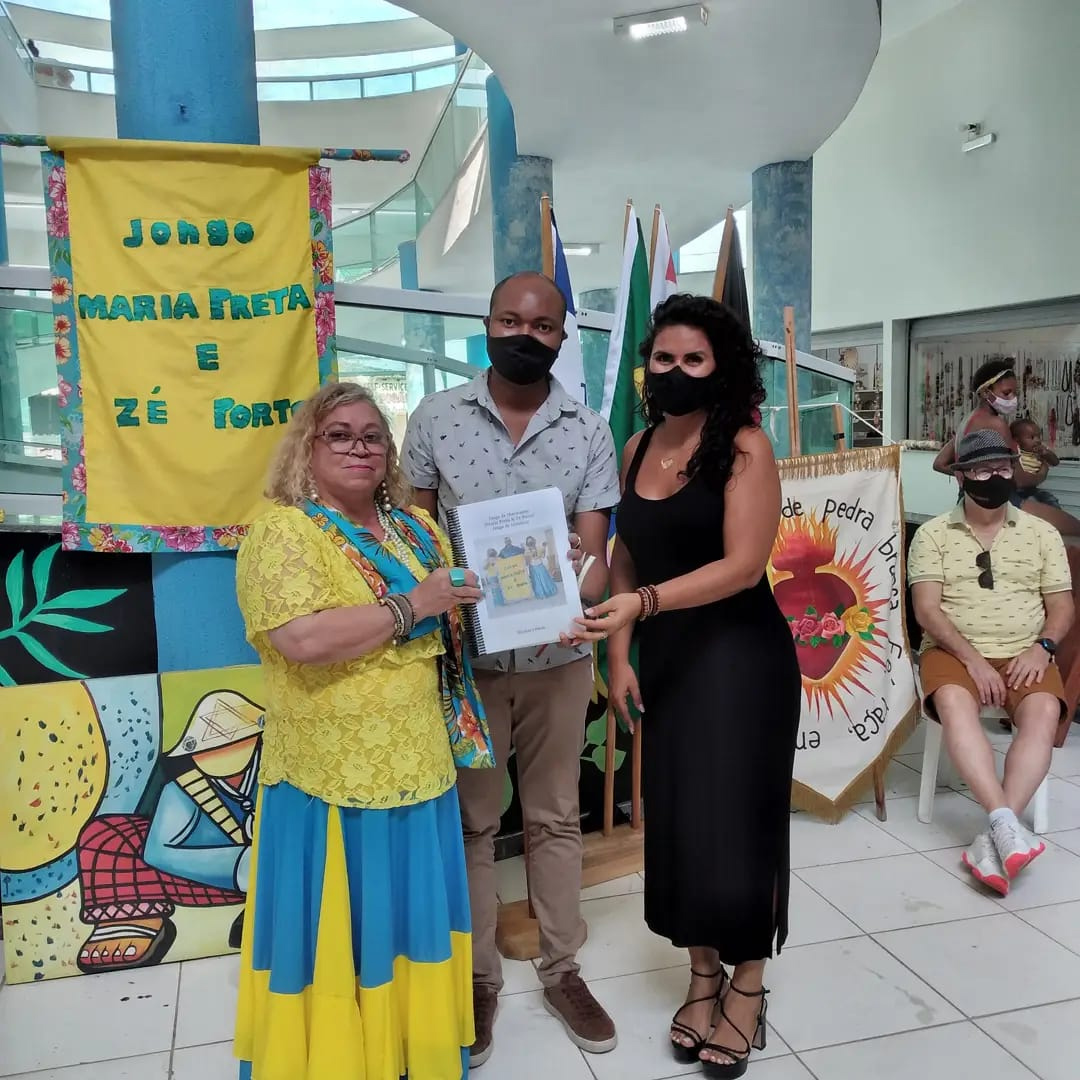 O Ponto também histórico e cultural do evento foi a presença ilustre do historiador e representante do IPHAN/ES, Filipe de Oliveira, que recebeu das mãos da escritora e diretora do Jongo, Bárbara Pérez, o esboço do seu livro da antropologia e memória do Jongo de Marataízes.