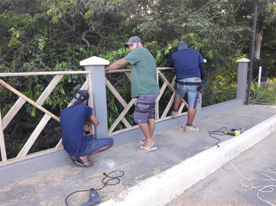 Cinco servidores do setor de carpintaria, da Secretaria de Obras, liderados pelo carpinteiro-mor Eduardo Costa Morais, toparam o desafio e na última sexta-feira (4) realizaram a colocação dos gradios de madeira em toda a extensão da ponte.