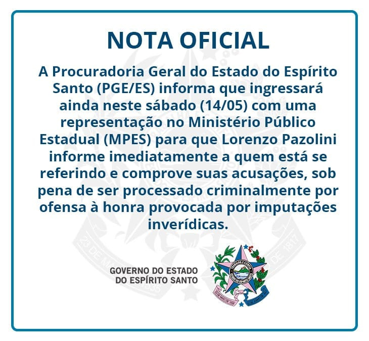 A Procuradoria-Geral do Estado (PGE-ES), de posse das denúncias, encaminhou uma representação ao Ministério Público Estadual contra Pazolini, onde exige a apresentação de provas.