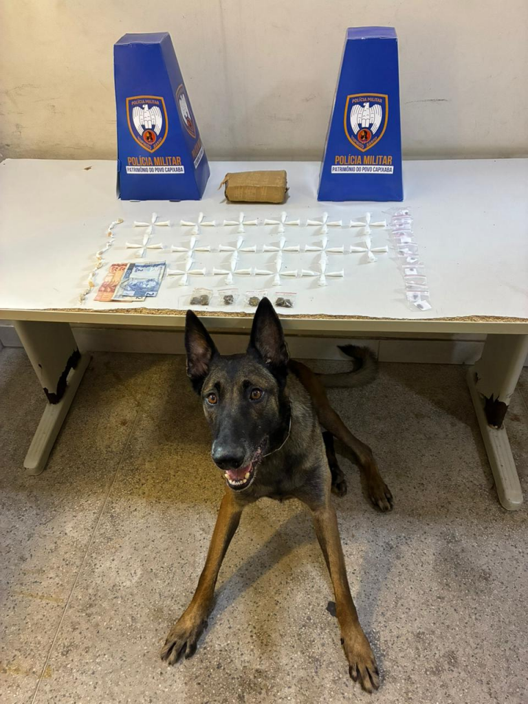 Mais tarde, durante patrulhamento no bairro Portal Club, os militares receberam informações de que entorpecentes estariam escondidos em um local conhecido na região. Com o apoio da equipe K9, foram localizadas 445 pedras de crack e 98 pinos de cocaína, sendo todo o material apreendido encaminhado à Delegacia de Polícia Civil.