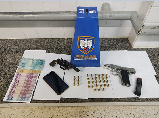 Durante o patrulhamento no bairro Aeroporto, policiais militares avistaram dois indivíduos em atitude suspeita a bordo de um veículo. Feita a abordagem policial, foram localizadas 20 munições de calibre .380 no interior do carro. Após afirmar que na residência do motorista haveria uma arma de fogo, os militares prosseguiram ao local e confirmaram o fato. Foi apreendido 01 Pistola Taurus Cal. 380, 01 Revólver Cal. 32, 27 munições intactas cal. 380, 06 munições intactas cal. 32, 01 Celular e R$ 287,00 em dinheiro.