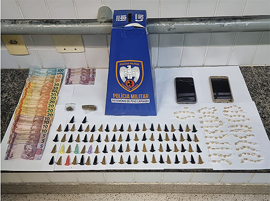 Já na madrugada de hoje três suspeitos foram detidos em flagrante tráfico de drogas no bairro Itapebussu. Por volta das 02h policiais militares realizam o patrulhamento tático no bairro e avistaram uma movimentação em frente a uma praça do bairro. Três suspeitos foram abordados e em posse dele foi localizado certa quantidade de entorpecentes. Ao verificar as proximidades do local da abordagem foi localizado mais entorpecentes escondidos em diversos pontos. Ao todo foi apreendido 82 pinos de cocaína, 121 pedras de crack, 02 buchas de maconha, R$ 550,00 reais em dinheiro e 02 aparelhos celulares. (Imagem)
