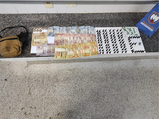 Posteriormente a referida bolsa foi localizada, tendo em seu interior 59 pedras de crack, 100 pinos de cocaína, 01 bucha de maconha e uma quantia em dinheiro perfazendo um total de R$ 1067,00 (MIL E SESSENTA E SETE REAIS).