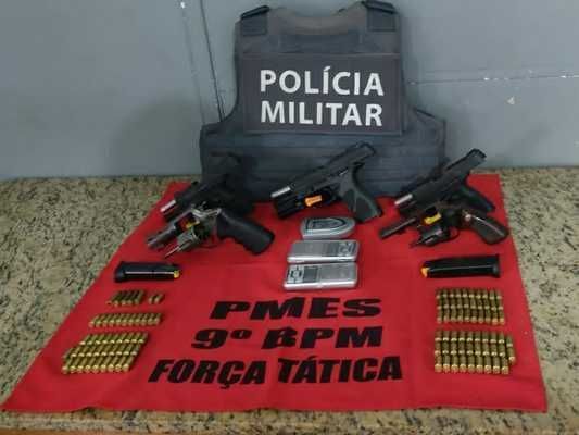 Foram apreendidos, no total, uma pistola da marca Taurus 9 milímetros, uma Taurus 40 milímetros, um revólver Rossi calibre 38, cinco carregadores, 105 munições, além de cheques e três balanças de precisão.