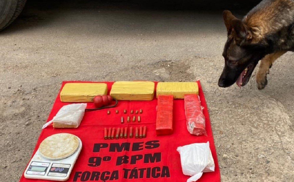 Em prosseguimento ao patrulhamento e com o auxílio do de um cão farejador, os policiais do K9, seguindo denúncias, encontraram uma área no meio da mata, no bairro São Luiz Gonzaga, onde localizaram um farto material ilícito, computando drogas (aproximadamente 4 kg de crack e dois quilos de maconha), além de munições para vários calibres e uma balança de precisão..