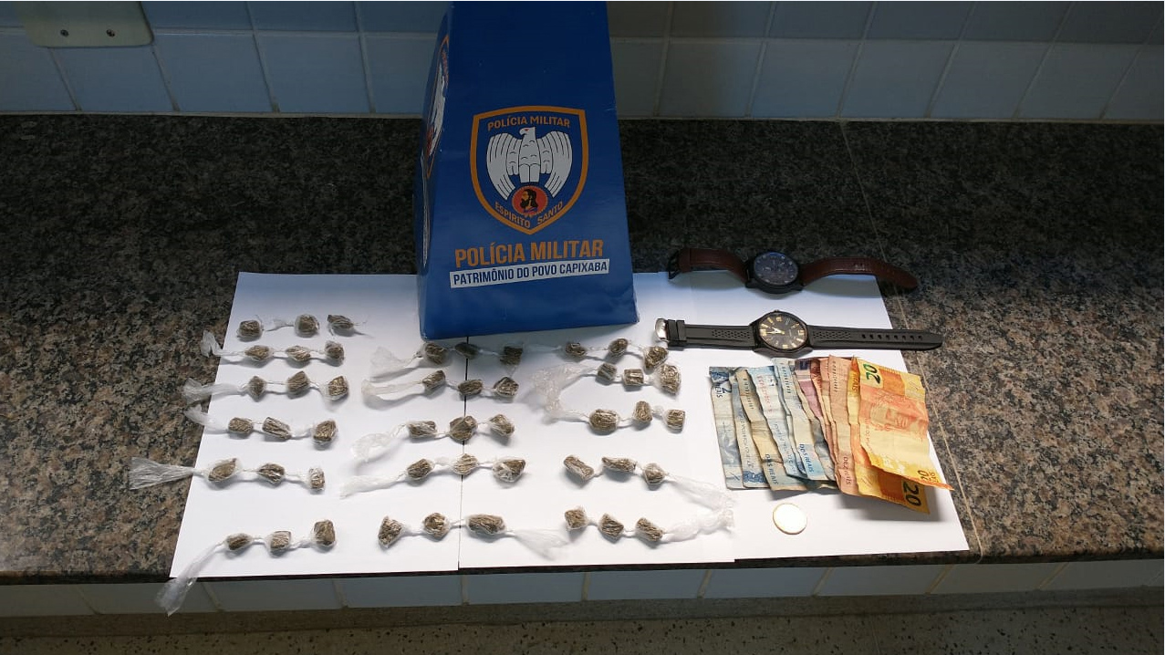Por volta de 20h, militares se depararam com um veículo na contramão da direção no bairro Muquiçaba. Na tentativa da abordagem o condutor acelerou o veículo e se evadiu em alta velocidade. Após o acompanhamento o veículo foi abordado na Praia do Morro com três ocupantes. Nas buscas no interior do veículo foram localizados vários materiais utilizados para o preparo e embalo de drogas. Na delegacia foi constatado que o aparelho celular de um deles era roubado