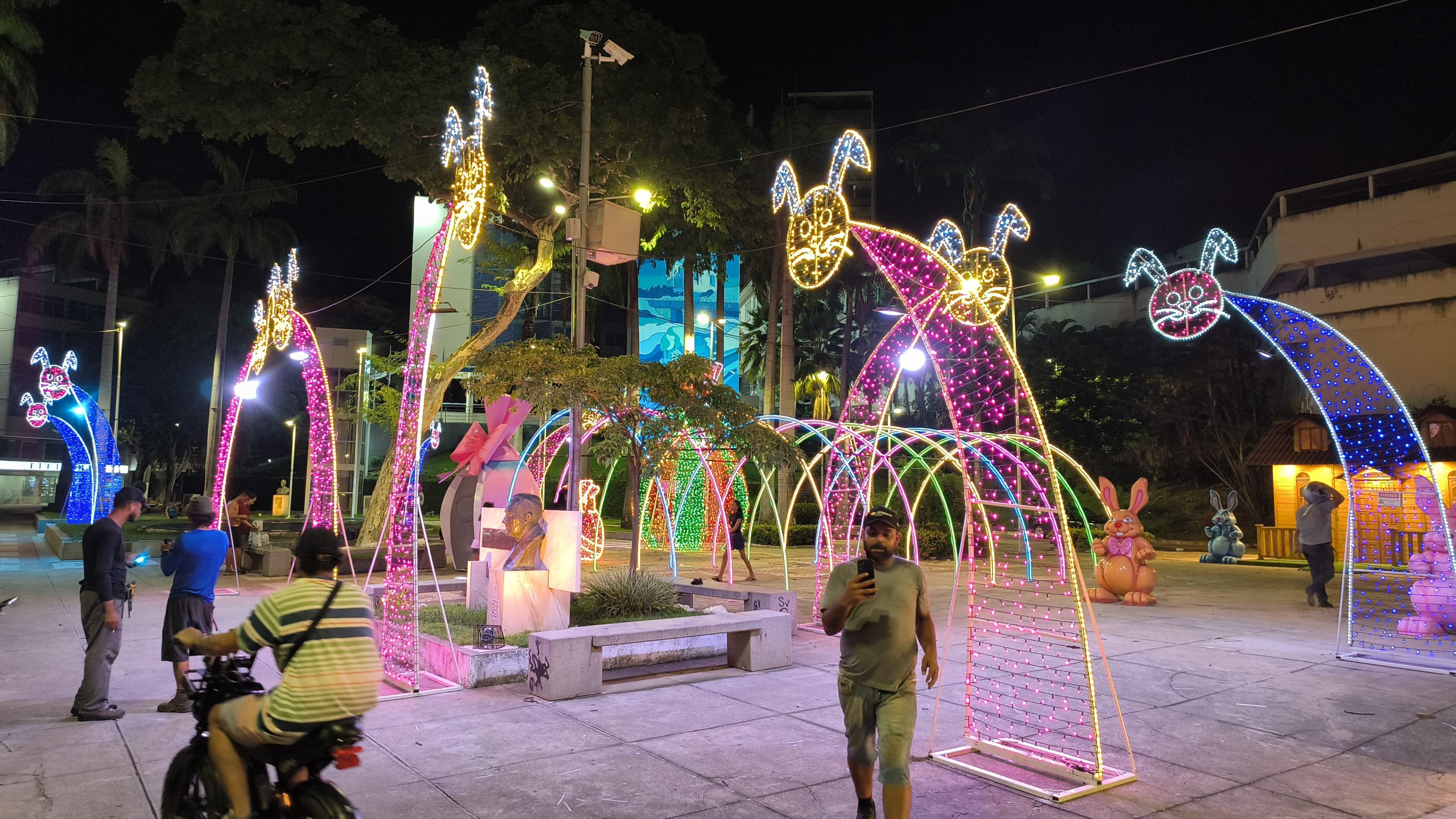 Entre os destaques da decoração estão o túnel temático iluminado, esculturas de coelhos, ovos de Páscoa, ovos gigantes em aramado e a Casa da Páscoa, criando um cenário ideal para passeios, fotos e momentos de convivência entre moradores e visitantes.