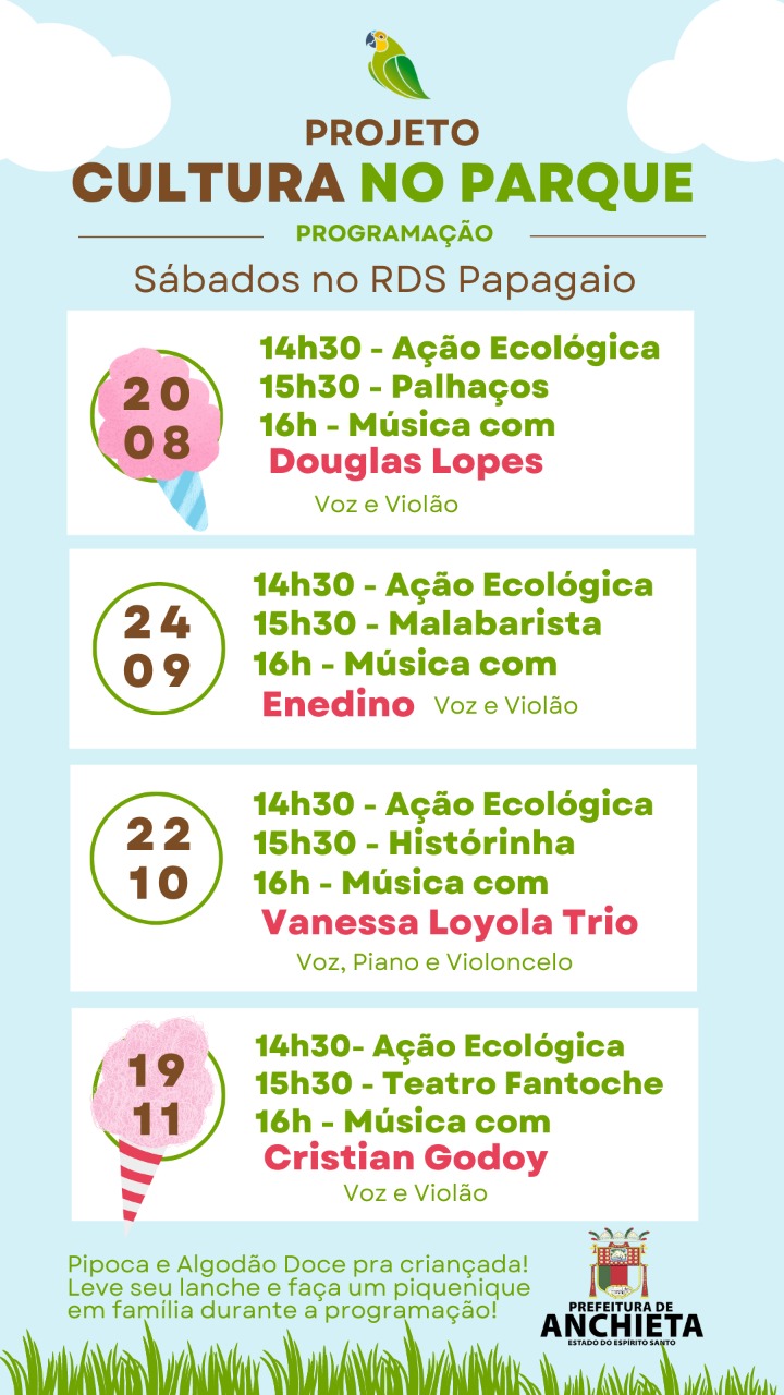 A Prefeitura de Anchieta, por meio da Gerência de Cultura e Patrimônio Histórico, lança neste sábado (20) o Projeto Cultura no Parque. O objetivo da iniciativa é ocupar o espaço uma vez por mês  com música, arte e cultura.