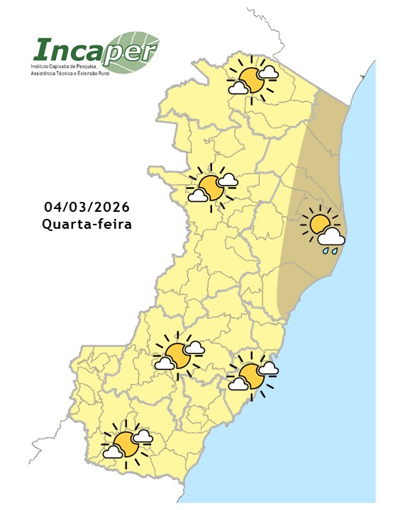 Nesta quarta-feira, a umidade transportada pelos ventos costeiros provoca chuva rápida na madrugada e pela manhã no litoral norte, com predomínio de tempo aberto nos demais períodos. Nas demais regiões do Espírito Santo, há poucas nuvens e não há previsão de chuva. As temperaturas máximas aumentam ligeiramente, e o vento sopra fraco no litoral.