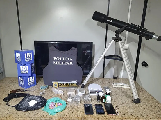 Com os presos foram apreendidos 920 g de maconha, 75 g de crack, 40 g de cocaína, 45 pinos de cocaína, 16 pedras de crack, nove buchas de maconha, R$988,00 reais em espécie, duas balanças de precisão, três aparelhos de celular, ácido bórico, éter e anestésico, um simulacro de pistola, uma garrucha, um motor de motocicleta com restrição de furto/roubo e uma luneta.