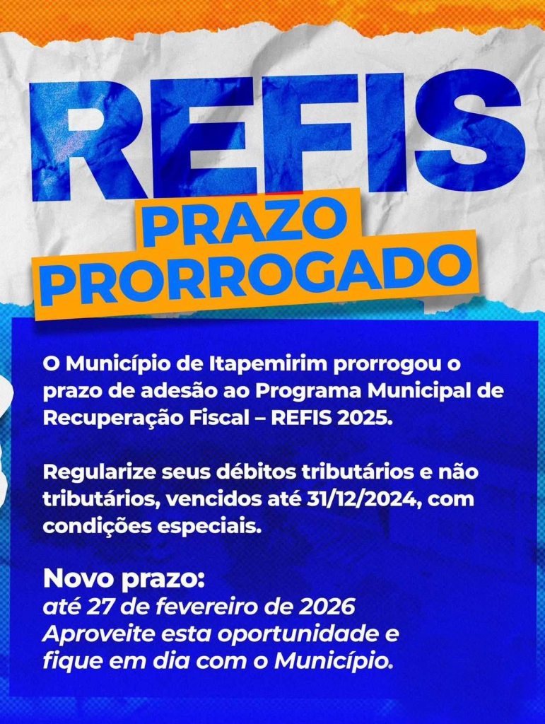 Com a prorrogação, o novo prazo para adesão ao REFIS 2025 vai até o dia 27 de fevereiro de 2026. A iniciativa busca estimular a regularização fiscal e possibilitar que cidadãos e empresas fiquem em dia com suas obrigações.