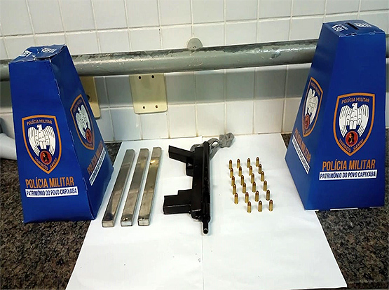 Ao realizar a inspeção no compartimento embaixo do bando da motocicleta a abordada demonstrou nervosismo, momento que foi localizado o armamento. Foi apreendido uma submetralhadora de fabricação caseira de cor preta, três carregadores do mesmo armamento e 23 munições de calibre .380.